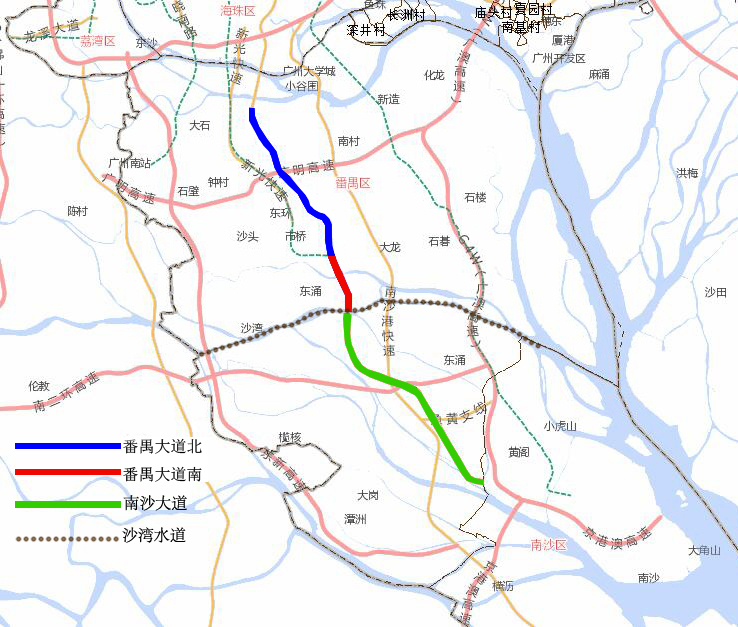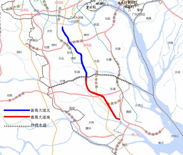 “番禺大道南”——北起沙湾大桥南端,南止万洲大桥西北端,长14239米,宽80米(以上见附图1)。
