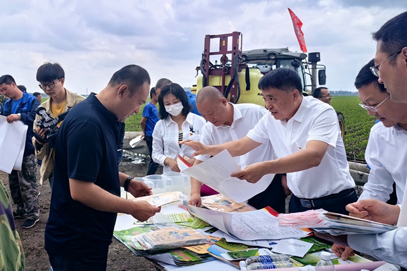 黑龙江省农业农村厅种植业管理处工作人员在哈尔滨市双城区地头,向农民发放科学用农药资料(2023年6月11日摄)。学习贯彻习近平新时代中国特色社会主义思想主题教育工作会议召开以来,黑龙江省农业农村厅种植业管理处将理论学习与实际工作相结合,深入“田间地头”调查研究、深入推进“千万吨粮食增产计划”,助力黑龙江省当好维护国家粮食安全“压舱石”,将主题教育成果融入到维护国家粮食安全的具体实践中。新华社发