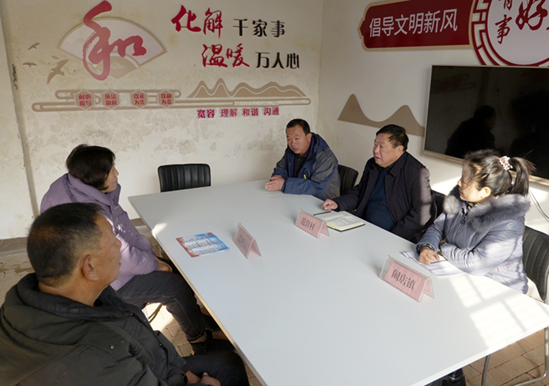 在宝丰县闹店镇范营村“摆理堂”,村镇干部(右)为村民进行信访调解(2023年12月20日摄)。河南省宝丰县积极推进四下基层工作深入开展,已打造闹店镇范营村“摆理堂”、石桥镇东大庄村“老娘舅茶室”等系列乡村社区服务阵地,协调邻里关系,有效化解各类矛盾,同时不断丰富工作内容,拓展服务功能,助力乡村振兴。