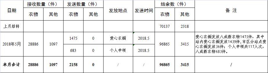 备注:2018年4月18日至2018年5月17日,共清理废旧衣物2760公斤,回收价每公斤0.80元,所得款2208元已上缴财政捐赠收入。