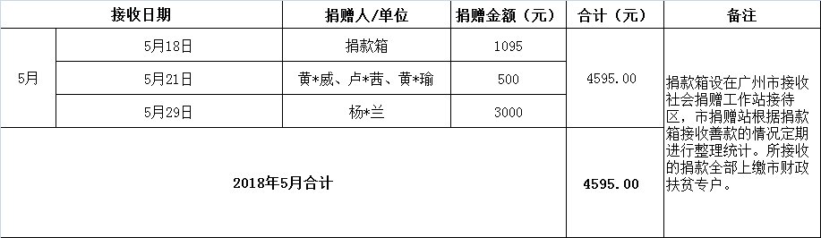广州市接收社会捐赠工作站关于接收捐款情况的公告(2018年5月)