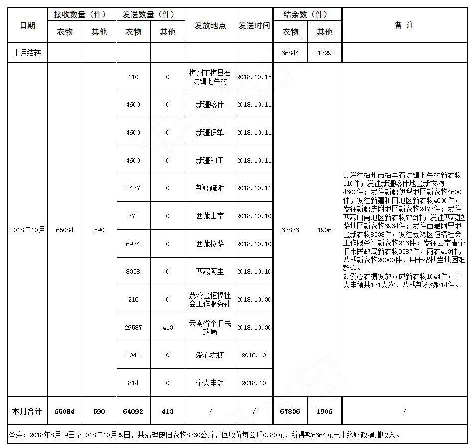 广州市接收社会捐赠工作站关于接收和发放社会捐赠物资情况的公告(2018年10月)