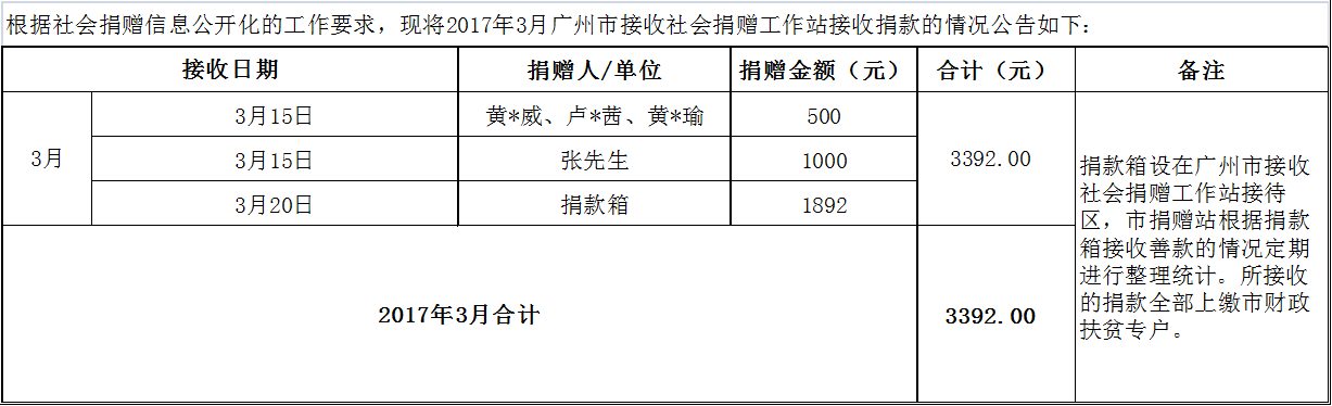 广州市接收社会捐赠工作站关于接收捐款情况的公告(2017年3月)