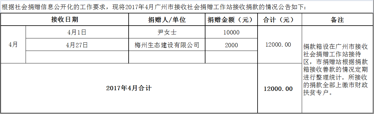 广州市接收社会捐赠工作站关于接收捐款情况的公告(2017年4月)