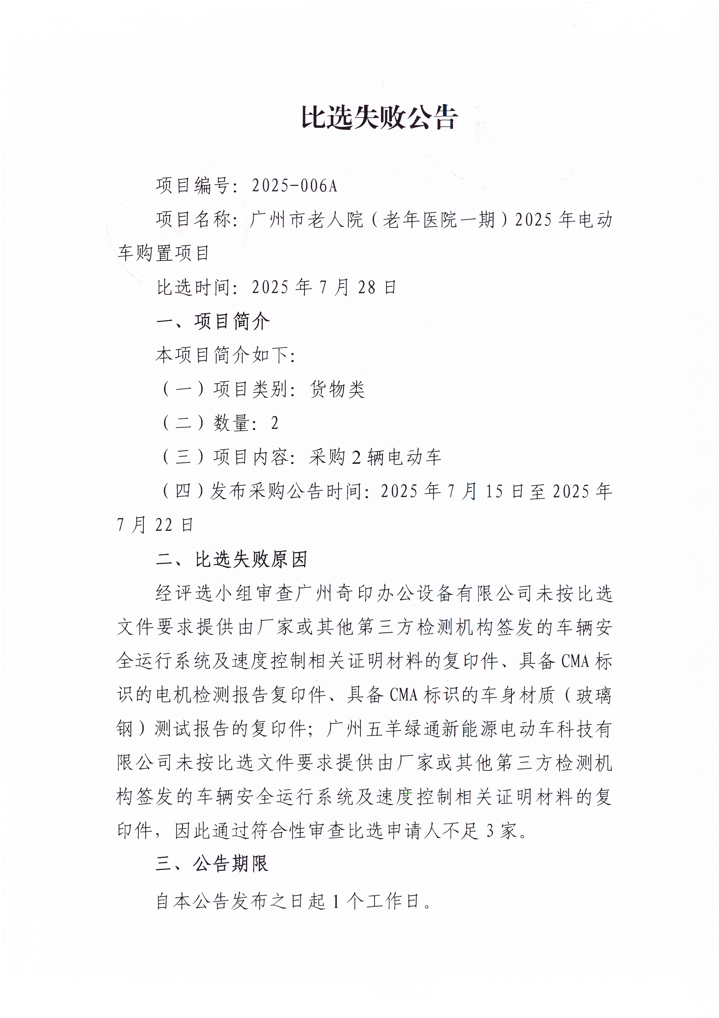 广州市老人院(老年医院一期)2025年电动车购置项目比选失败公告