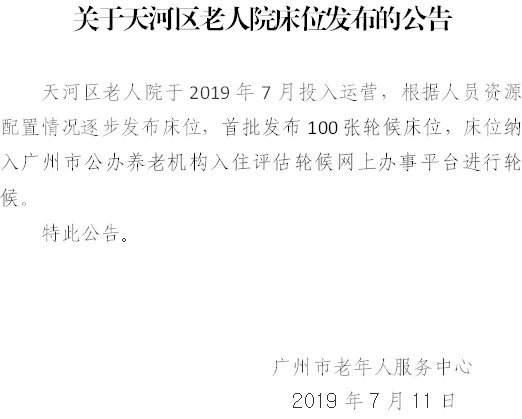 关于天河区老人院床位发布的公告